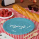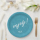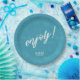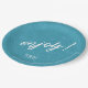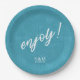 Colorful, paper plate design featuring a seamless pattern of palm leaves in shades of teal with bold, white 'Enjoy text. Add your initials and wedding date using the provided template. This tropical design is perfect for summer, beach and tropical weddings, birthdays and other special events. Search ID577 to see matching products.