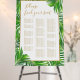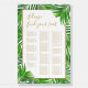 Lush green tropical palm leaf background pattern and modern gold typography on a large foam board seating chart for a tropical beach wedding, bridal or baby shower, or bat mitzvahs inspired by botanical island tropics! Just type your guest list into the template to easily create your own seating chart.