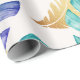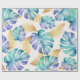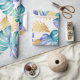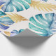 Watercolor jungle leaf wrapping paper in accents of green, blue and gold.