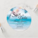 Get your guests hyped for your big day with this Elegant Tropical Palm Ocean Summer Beach Wedding Save the Date Round Card! Featuring a dreamy blue ocean backdrop, soft sandy beach tones, warm summer sunshine, and relaxing coastal wave vibes, this design is perfect for couples planning a laid-back but classy beach wedding. Whether you're saying “I do” in Hawaii, Florida, California, the Caribbean, or at your favorite seaside resort, this Save the Date brings those tropical destination wedding feels straight to your guests’ mailbox. Fully customizable, add your names, wedding date, and location in just a few clicks. Perfect for summer weddings, coastal celebrations, and couples who want that chic island aesthetic. Don’t wait around, snag your invites before it’s too late! Hit personalize, make it yours, and order now!