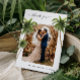 Elegant tropical palm photo wedding thank you card featuring a romantic couple portrait framed by lush beach-inspired greenery and clean minimalist typography. Perfect for destination weddings, seaside ceremonies, island celebrations, and tropical receptions, this refined design offers a heartfelt way to thank guests after your special day. A beautiful choice for couples seeking a beach destination wedding thank you card with timeless style and warm, personal charm.