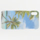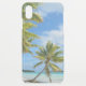 Apple iPhone XS Max phone protection case with a hanging palm tree on a white sand beach of a tropical island in the Pacific Ocean belonging to the Tahiti archipelago French Polynesia.
