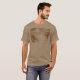 A t-shirt with a tropical vintage etching of palm trees on a sandy beach and beautiful clouds over calm ocean waves in brown.