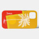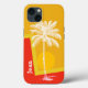 Stylish iPhone case, with graphics of a palm tree over an orange and yellow abstract sunrise background. Personalize the custom text for yourself or as a great gift idea.