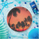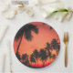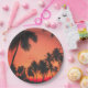 A beautiful silhouette of tall tropical palm trees on a sunset background. The sunset sets the sky ablaze in pink and orange colors.