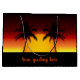 A vibrant tropical scene with palm tree silhouettes and a large yellow sun. Birds fly across a warm red and orange sky, capturing a peaceful summer beach atmosphere. This high-contrast silhouette design is perfect for those who enjoy coastal scenery and travel.