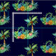 Tropical Palm Trees and Floral on Navy - features exotic floral elements and tropical greenery of bird of paradise, plumeria, and pineapples, in shades pink, yellow, green, and orange.