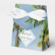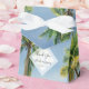 This design features tropical palm trees on a beach. The beautiful greenery of the palms contrast against the blue sky and water. The opaque white diamond element brings the modern typography to the forefront. A perfect fusion of modern and chic. Palm tree greenery design ideal for a tropical beach destination wedding. Beach wedding favor box design with modern elements. Matching wedding invitations and other stationery items are also available.