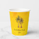 Tropical Bright Gold summer swim party paper cups, with a palm trees illustration design and customizable lettering. A great addition your picnic pool party with a beach theme.