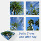 A set of 4 coasters each with a different beautiful photographic image of tropical palm trees with their green palm fronds against a deep blue sky.