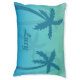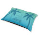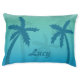 This dog bed has a tropical design of blue palm tree silhouettes on an aqua blue background color. In the middle there is a personalizable text area for the name of a pet.