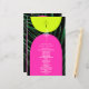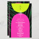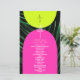 Neon yellow and pink arches over dark palm leaf background with vertical monogram at top front and white line art palm tree art and white text. Back features palm leaf line art with arches and white text.