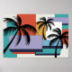 This vibrant artwork blends tropical palm silhouettes with a geometric backdrop of rectangles in warm, sunset-inspired colors. The bold contrast between the black palm trees and the colorful, modern blocks creates a striking visual that evokes a retro beach vibe. The design combines tropical elements with abstract geometry, making it ideal for contemporary decor or beach-themed graphic projects.