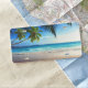Perfect photo on a perfect day in the tropics! Blue tropical sea waves, white sandy tropical beach with lush green palm trees. The day is sunny and warm with a light blue sky in this tropical island paradise beach scene.