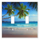 Perfect photo on a perfect day in the tropics! Blue tropical sea waves, white sandy tropical beach with lush green palm trees. The day is sunny and warm with a lite blue sky in this tropical island paradise beach scene.