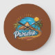 This vibrant tropical logo features a sunny island scene with blue skies, palm trees, mountains, and clear ocean water. The bold circular frame and flowing “Paradise” script create a relaxed, modern beach aesthetic. With its bright colors and clean outlines, this design captures the feeling of escape, travel, and summer vibes, making it perfect for anyone who loves warm coastal scenery and tropical destinations.