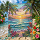 Pretty tropical thinking of you card. A cute coastal themed poem for a friend of family member to let them know they are in your thoughts. Gorgeous ai impasto oil painting style illustration of the blue ocean, a sandy beach surrounded by palm trees at sunset. Inside is a cute crab and sea glass.