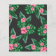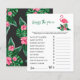 Baby shower invitation design features pink flamingo with lush green palm leaf fronds and tropical hibiscus flowers. "Aloha Baby". A tropical floral pattern with black background color dresses up the back of the card.
