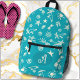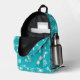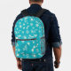 Aqua blue backpack with tropical images pattern. Personalize with her first name initial on the zipper pocket. The monotone, off-white pattern, which covers the bag, is made up of palm trees, sea stars, seashells, sunglasses, and more. The initial template is also off-white and is printed over a darker blue oval shape.