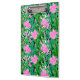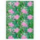 Vector seamless floral pattern with tropical decor: big pink flowers on background of palm leaves silhouettes, bushes, branches and jungle foliage © and ® Bigstock® - All Rights Reserved.