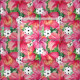 Tropical pickleball pattern with green leaves, pink hibiscus flowers and white pickleballs on dark green background