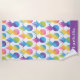 Tropical style beach towel features a pattern of vibrant rainbow colored pineapples with a watercolor tie-dye gradient. Personalize the custom text with violet purple background with first name, last name, or other preferred wording.