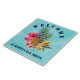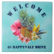 Tropical pineapple and flowers welcome house tile, with address. Pineapples, hibiscus, plumeria and bird-of-paradise flowers decorate the center of this ceramic square tile. Aqua blue background with curved "welcome" text at the top and template for street address at the bottom.