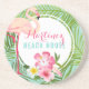 These fun summer personalized drink coasters feature a pretty pink flamingo with lush frame of green palm leaves and tropical hibiscus flowers. Stylish custom text can be personalized with your last name monogram and other custom wording to describe your tropical, Hawaiian themed oasis! Vibrant colors include pink, magenta, green, seafoam, and aqua blue.