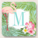 Personalized coaster design features a custom monogram initial / letter framed by a pretty pink flamingo and lush tropical palm leaves and hibiscus flowers. Vibrant colors include pink, magenta, yellow, green, seafoam, and aqua blue.