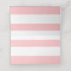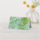 Stylish folded escort cards feature a tropical style design with two pink flamingoes, and patterns of green palm leaves and pink cabana stripes.