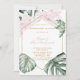 Design features tropical element with green watercolor palm leaves and pink florals with gold geometric frame. Calligraphy or type writing with the design artwork in gold color. This is a mix and match collection piece. Great for your wedding celebrations!