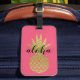 A bold luggage tag featuring a gold pineapple with "Aloha" in playful script on a bright pink background. This vibrant tropical design makes a statement on any suitcase or beach bag. A fun gift for the traveler who loves bold color and island-inspired style.