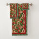 Green tropical leaves and red ginger plants on an ivory geometric pattern on a copper background, this bathroom towel set is bordered with palm tree fronds and is a perfect accent to your home decor.
