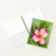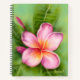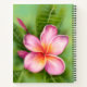 A lovely Plumeria blossom, also called frangipani, with petals of pink shading to orange at the center and surrounded by green tropical leaves embellishes each sid of this notebook along with name text that may be personalized.