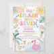 Make a splash with this colorful tropical pool party birthday invitation, perfect for kids celebrating a summer milestone! Featuring playful illustrations of ice cream, popsicles, watermelon, flamingo floats, palm trees, and sunshine, this design sets the tone for a fun-filled celebration. The vibrant pastel colors and whimsical fonts create a cheerful, beachy vibe that guests will love. Ideal for pool parties, summer birthdays, or tropical-themed events, this invitation is both stylish and festive.