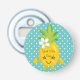 A fun and tropical design, this round button bottle opener features a white polka dot pattern on an aqua colored background. "Good Vibes Only" is written in cool dark blue font on a bright yellow pineapple. Order yours today!
