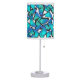Stylish and trendy table lamp printed with an all over pattern of beautiful hand drawn electric blue and aqua Blue Morpho butterflies on a white background