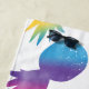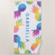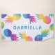 Bright and fun tropical beach towel featuring scattered watercolor pineapples in vibrant rainbow tie-dye colors on a crisp white background. A bold blue personalized name takes center stage for a custom look that stands out on the sand. All text is fully editable so you can add any name or monogram. A colorful summer essential perfect for pool parties, vacations, and beach days.