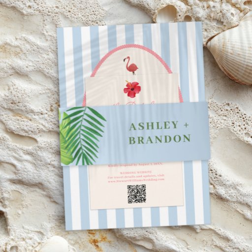 Complete your retro tropical wedding suite with this vibrant details card featuring classic blue stripes and a bold pink tropical flower. The playful coastal design captures a fun island vibe while keeping your stationery coordinated and stylish. Perfect for sharing accommodations, weekend events, directions, or dress code information, this insert adds personality and polish to your celebration.