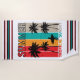 Bold, energetic, and full of summer spirit, this vibrant design captures the thrill of a tropical adventure. Fiery red and orange tones meet cool teal and beige stripes, setting the stage for a surfer’s silhouette strolling toward the waves. Towering palm trees frame the scene, while playful typography emphasizes the carefree essence of SUMMER and TROPICAL SUNSET. This dynamic look is perfect for anyone who lives for warm evenings, ocean breezes, and the endless call of the surf.