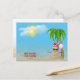 Christmas sand snowman with sunglasses and striped cap in beach sand with holiday lights on palm tree.