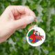 This colorful Scarlet Macaw keychain has a cartoon drawing of the parrot inside a blue circle, with a tropical palm tree behind it. One of the bird's wings is outstretched. The species name is printed at the bottom. Unique Scarlet Macaw gifts for parrot lovers.