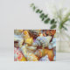 Seashells photography postcards. Many pretty and colorful shells cover the front of this blank card. A brown spotted olive shell, worm shell, naticas and scallops are included.