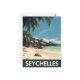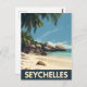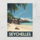 This card features a stunning vintage-style illustration of a tropical beach in the Seychelles. The design captures the iconic granite boulders, lush palm trees, and clear turquoise water that the islands are known for. The retro-inspired color palette and bold typography give it the feel of a classic travel poster, perfect for sending a note from a serene getaway or for any lover of beaches and tropical destinations.