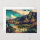 A Hawaii postcard of a tropical beach cove with towering mountains and a secluded beach with palm trees. This art postcard is part of a series of postcards created in a post impressionism art style and inspired by different locations around the world and does not necessarily depict an actual location