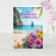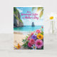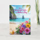 This card shows a tropical beach scene with a lush bouquet in the foreground, where soft pink roses mingle with yellow and purple daisy-like flowers and tiny white filler blooms, creating a sweet, close-knit feel ❤️. Near the left edge, an orange butterfly rests on sunlit sand as if drawn to the flowers’ gentle welcome. Behind the bouquet, the shoreline curves toward clear turquoise water, and small waves slide in with a calm, affectionate rhythm. On the left, green cliffs rise steeply, adding a cozy sense of shelter around the open coast. Farther out, a lone rock formation stands in the glowing sea like a quiet companion in the distance. Across the sky area, the message “to a Wonderful Sister on Mother’s Day” appears in pink, flowing lettering, centered high so it floats above the scenery 🌼. The letters sit against a bright blue sky with soft clouds, making the words easy to spot without covering the main view. A palm frond reaches in from above with a warm sun flare near its tip, casting a golden touch over the sand and water.
