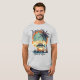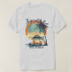 If you are in the habit of "hanging out" on the beach during the summer, this might be the shirt for you! A retro style van is parked beneath a palm tree, and a surf board leans against it. The ocean background at sunset has a flock of birds flying high, and the text says "Tropical State of Mind". The predominant colors of dark teal green, blue, orange and yellow look great on most of the colors offered.