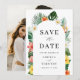 An elegant wedding save the date in tropical summer theme featuring hand painted watercolor palm leaves, banana leaves, hibiscus, plumeria, and a lovely photo of the couple at the back.