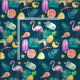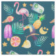 This cute fabric sports an colorful pattern of summer images, including a toucan bird, a pink flamingo, an ice cream cone, ice cream bars, a bright grapefruit slice, and a lemon, all surrounded by gold stars and green palm leaves. The multi colored, bright images are placed on a dark teal background. Bright, colorful and fun, no matter where you spend the summer!