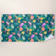 Fun tropical images make a colorful pattern on this cute beach towel. Images include a toucan bird, a pink flamingo, an ice cream cone, ice cream bars, a bright grapefruit slice, and a lemon, all surrounded by bold stars and green palm leaves. The multi colored, bright images are placed on a dark teal background, and repeated across the surface of the towel. Bright, colorful and fun, no matter where you spend the summer!